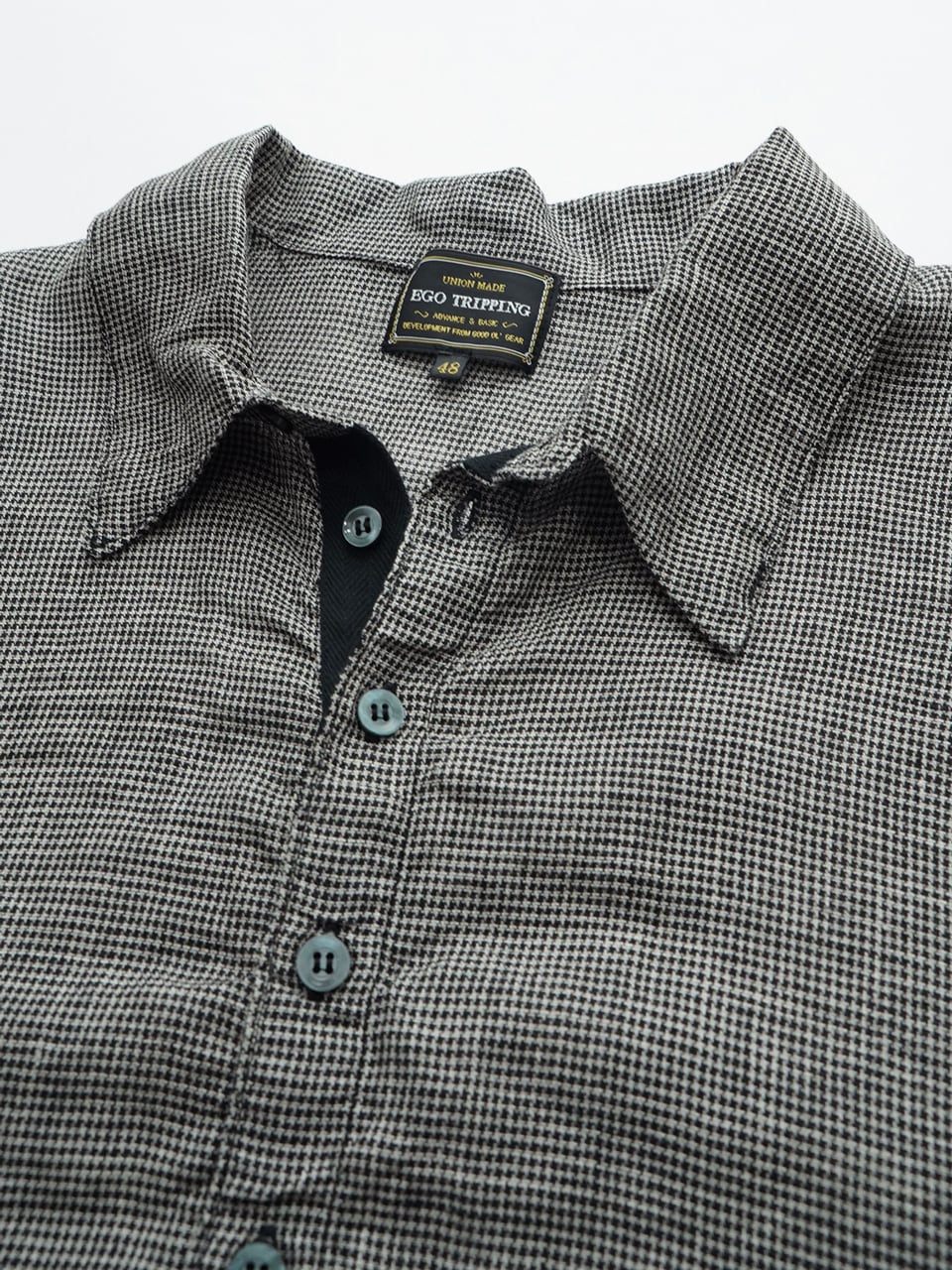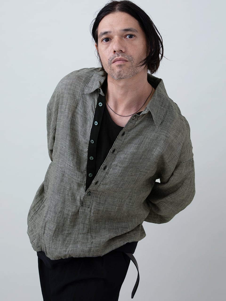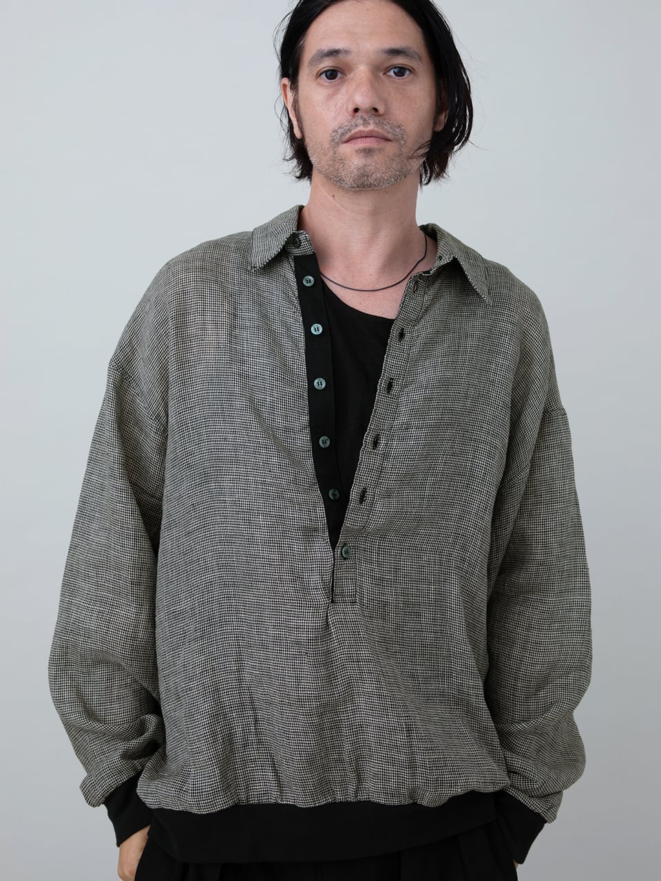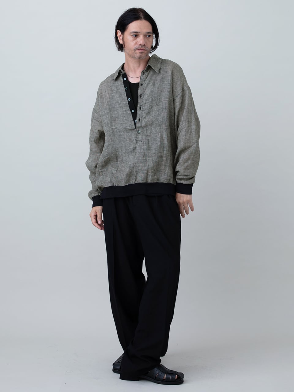 前立てを深めにとったプルオーバータイプの仕様により、シャツともカットソーとも言い難い不思議で魅力的な存在感を放っています。