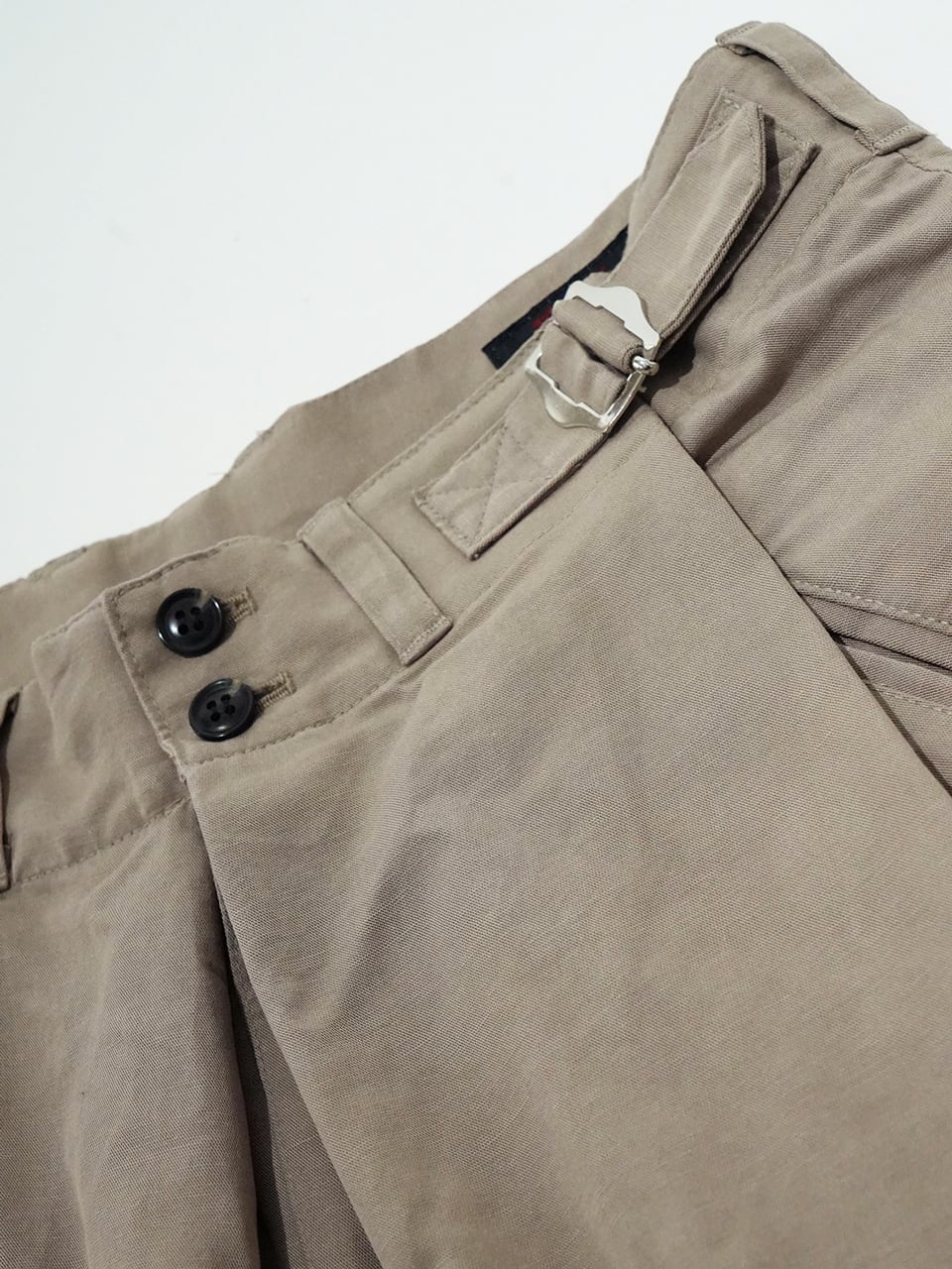 深いボックスタックは歩行時に美しい動きを演出し、サイドタックはポケット周りに自然な立体感をもたらして、トラウザーズ全体に躍動感を与えています。